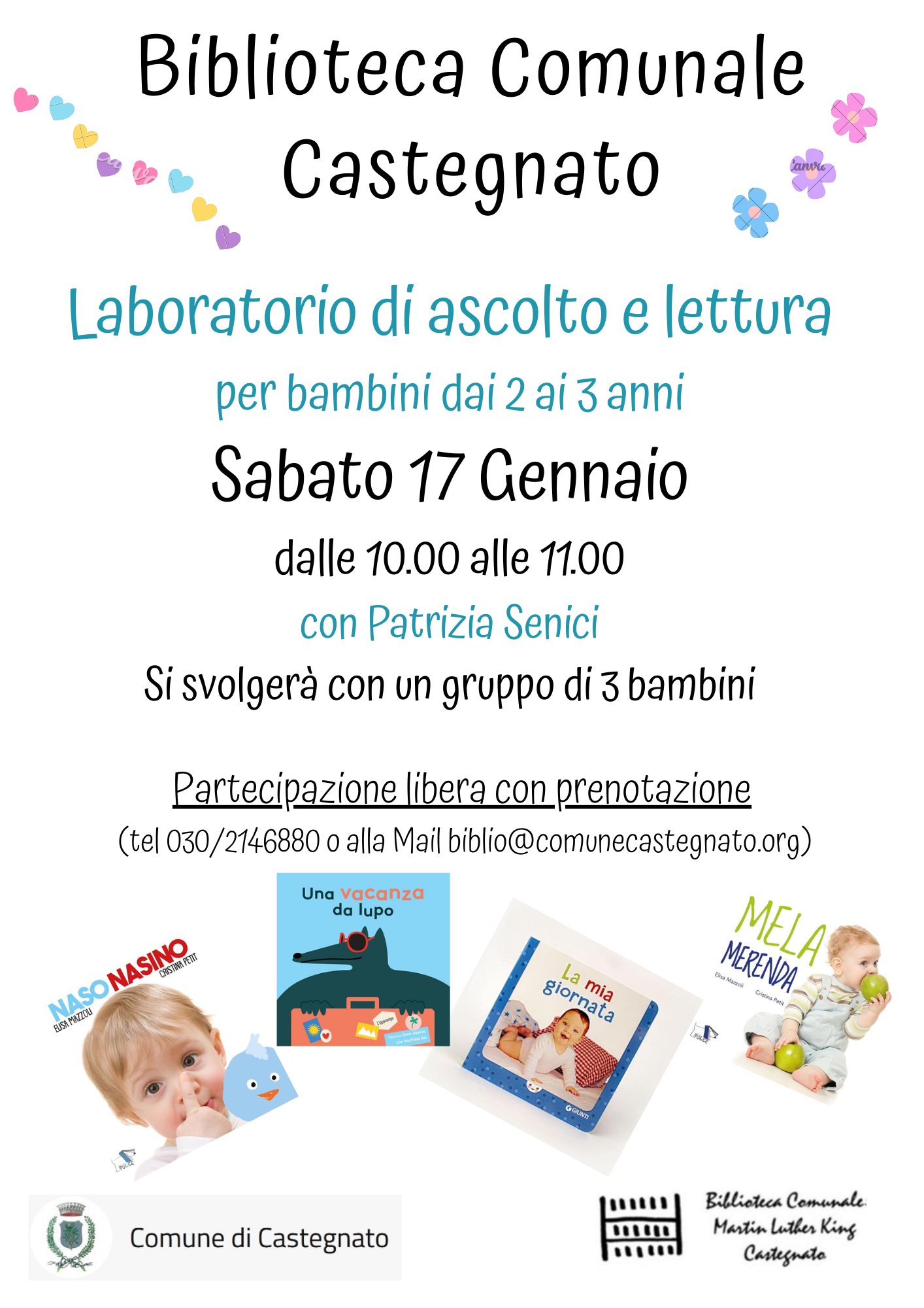 La Biblioteca Comunale di Castegnato propone un Laboratorio di ascolto e lettura dedicato ai bambini dai 2 ai 3 anni, un momento speciale pensato per avvicinare i più piccoli al piacere delle storie attraverso la voce, le immagini e l’ascolto.