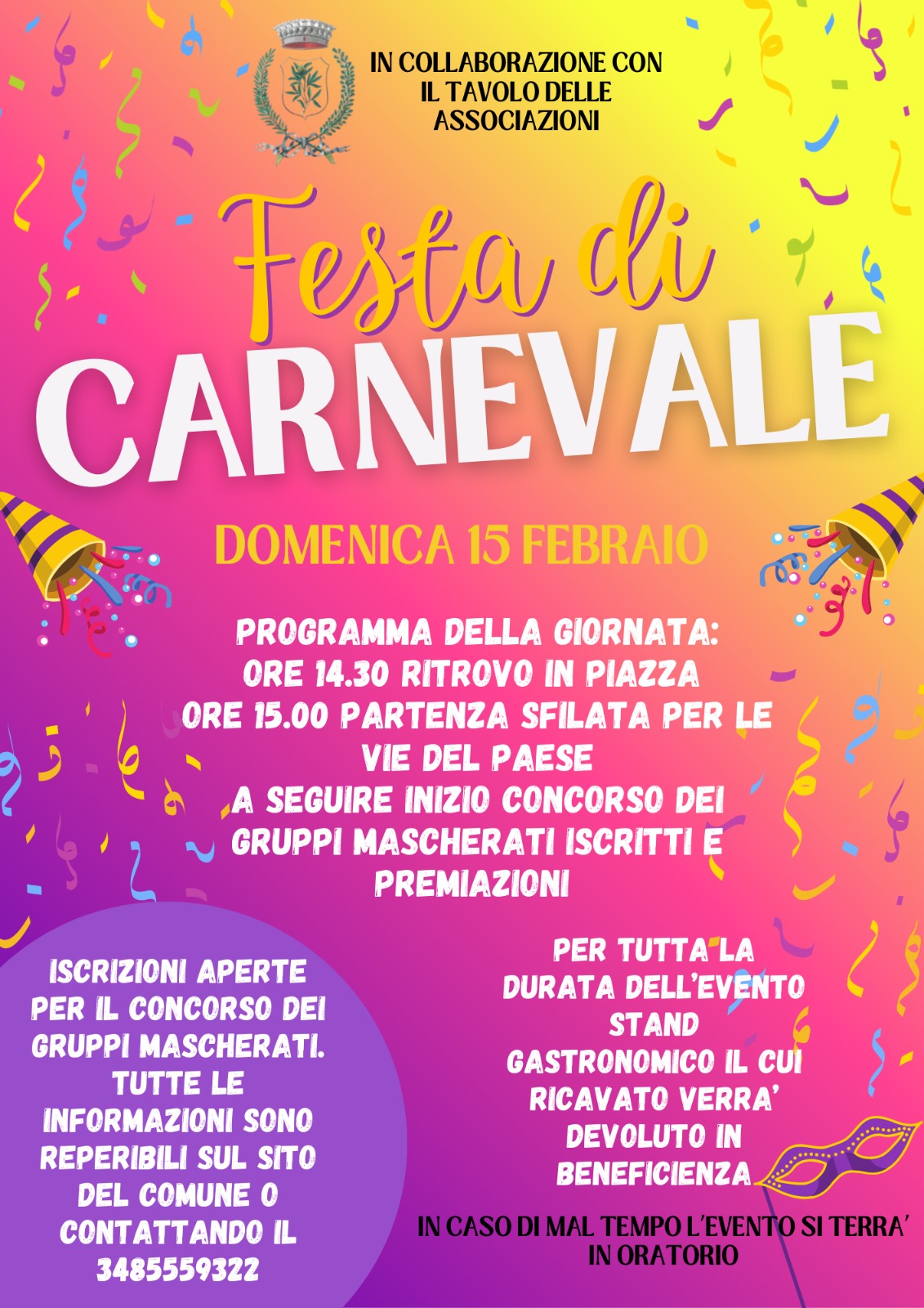Sono aperte le iscrizioni per il concorso dei gruppi mascherati per la Festa di Carnevale di domenica 15 febbraio. E’ necessario compilare il modulo di iscrizione allegato, che va presentato all’Ufficio Protocollo o in alternativa spedito all’indirizzo email protocollo@comunecastegnato.org entro e non oltre MARTEDI 10 FEBBRAIO.